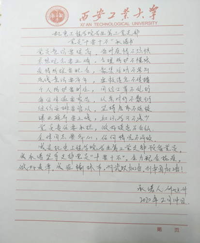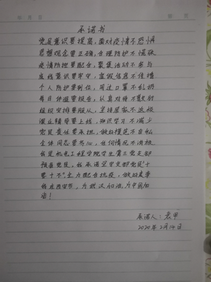 在活动的最后,全体党员展示了自己在家中按照要求使用84、酒精等消毒液对家中进行消毒的情况,抄写并宣读了抗击疫情承诺书,树立坚定不移的信念,表明共抗疫情的决心。