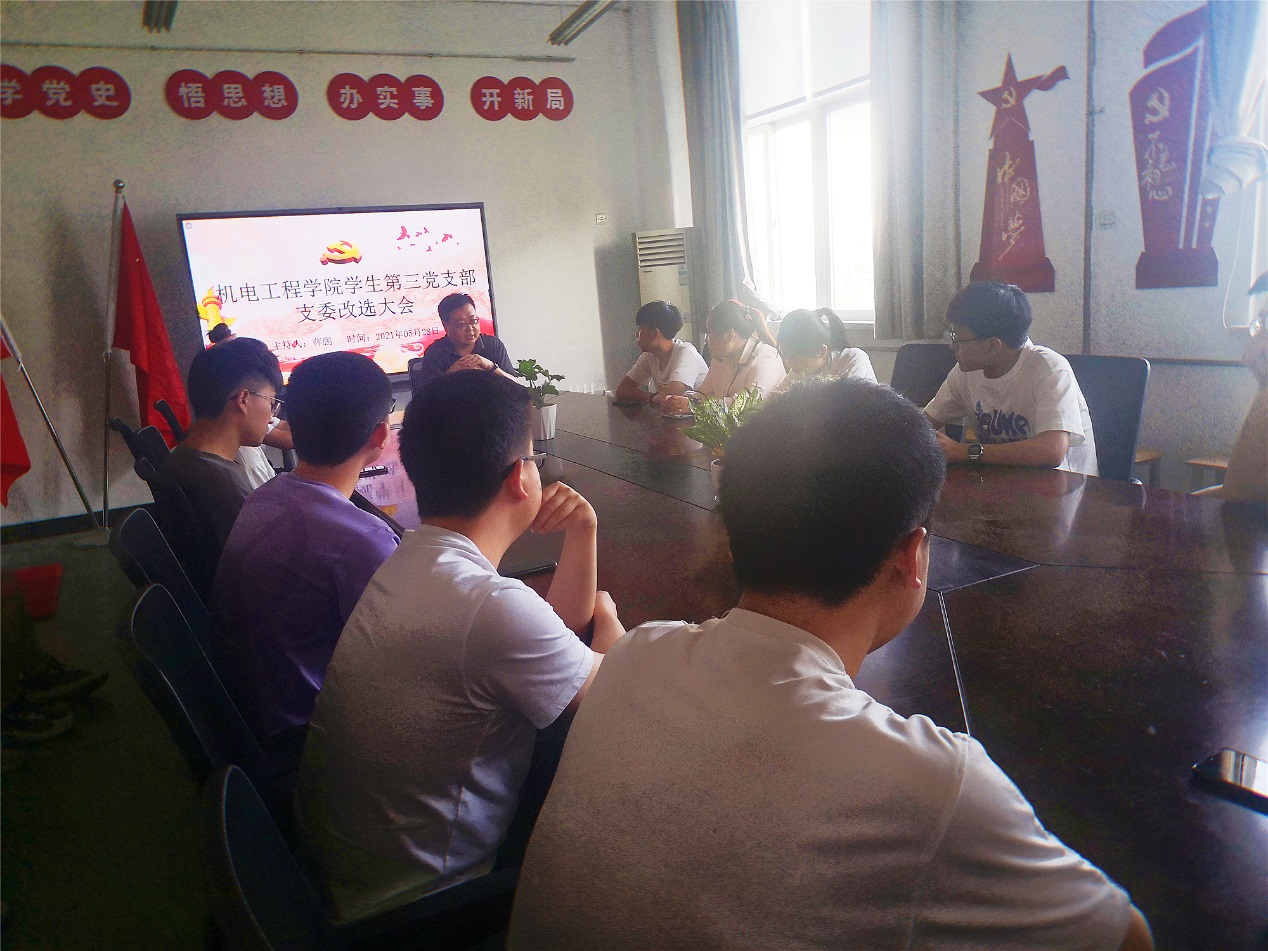 学生第三党支部进行了换届选举工作。选举工作由党支部书记薛鹏老师主持,首先薛老师向大家公布了选举工作流程,全面总结了党支部各项党建工作,党员的发展、活动的开展、基础工作的规范等情况,全体党员对党支部的工作给予了高度认可。