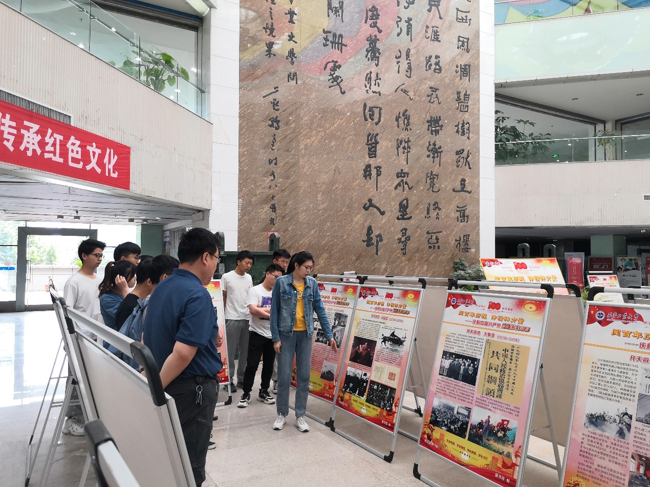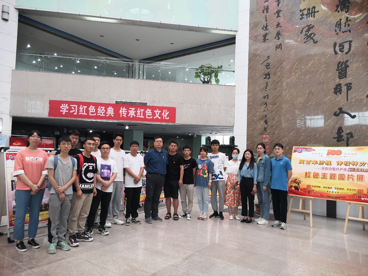 学生第三党支部全体师生党员在图书馆二楼参观“阅百年历程,传精神力量——庆祝中国共产党成立100周年红色主题图片展”主题教育活动。