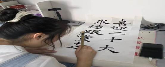 活动伊始,王熠凡以“喜迎二十大,永远跟党走”为主题带领支部成员探寻历次党代会的足迹,引导广大党员重温党的伟大奋斗历程,迈出“永远跟党走”的坚定步伐。学生第五支部全体成员集体朗诵《可爱的祖国》,献礼二十大。最后,支部王越同志展示了自己为喜迎二十大创作的书法作品。