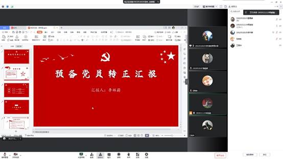根据大会议程,首先由预备党员李林蔚同志介绍其在预备期一年内的思想学习情况,李林蔚同志从对党的认识、入党动机、自身学习、志愿服务、竞赛、考研等方面进行汇报。之后由雒嘉豪同志作为其入党介绍人汇报李林蔚同志在预备期内的基本情况,着重强调了李林蔚同志在疫情防控期间,主动作为申请作为志愿者投入到防疫工作中,并且号召全宿舍成员一起参与到防疫工作中,为学校的防疫工作贡献自己的一份力量,同时也将这种精神传递给了周围的同学。经过全体与会人员根据预备党员的自我陈述和入党介绍人的陈述进行投票,由杨丽丽同志代表支部做出决议,同意李林蔚同志按期转正,支部同意接收李林蔚同志为正式党员。