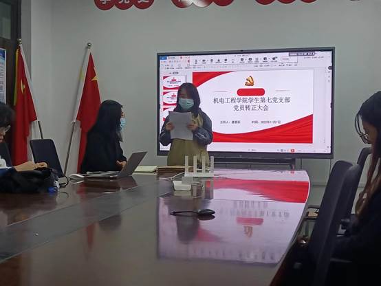 学生第七党支部在学校工科二号楼405教室召开党员转正大会,由支部书记唐雅莉老师主持。
