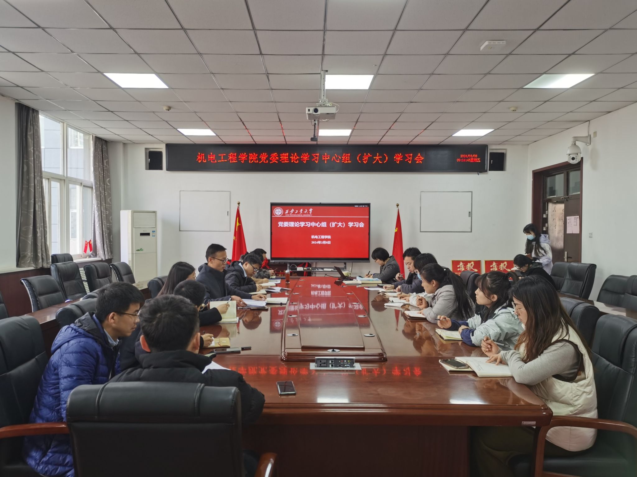会议集中学习了2024年政府工作报告、习近平在学习贯彻习近平新时代中国特色社会主义思想主题教育总结会议上的讲话、习近平在参加江苏代表团审议时的讲话、习近平在中共中央政治局第十一次集体学习时的讲话。参会人员围绕“认真学习全国两会精神,持续推进学院高质量发展”进行主题研讨交流。会议强调,要把学习宣传贯彻落实习近平总书记重要讲话和两会精神作为当前一项重要政治任务,掀起学习热潮,确保党中央决策部署和全国两会精神落地生根、见到实效。