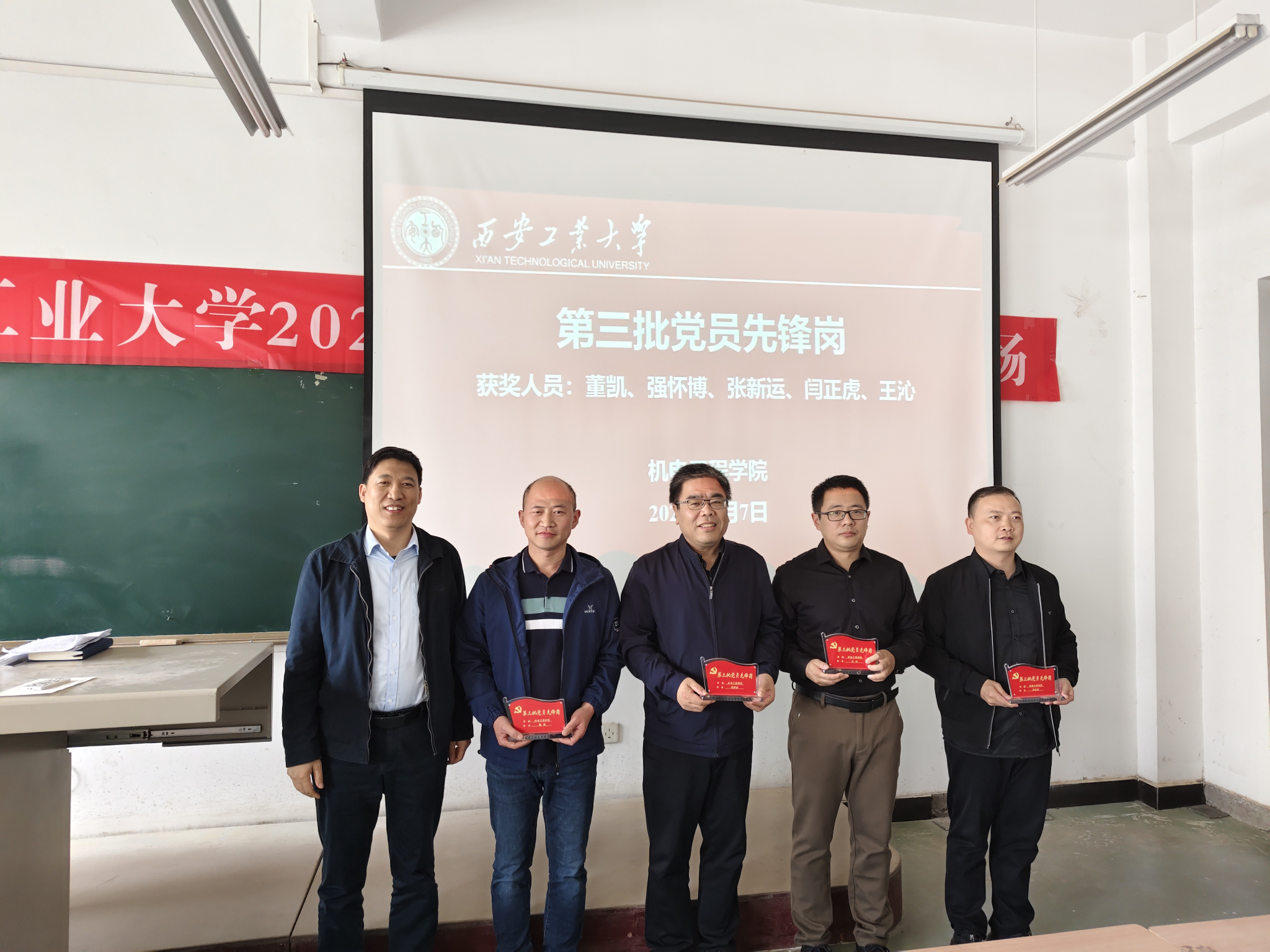 会上,程新峰介绍了学校设立党员先锋岗基本情况,回顾了工作开展情况。他指出,学校自2020年设立党员先锋岗以来,先后共设立三批先锋岗,学院共有15名同志获此殊荣。近年来他们在学习、工作和生活中通过亮身份、树形象,不断增强宗旨意识、大局意识、责任意识、服务意识,积极投入到学院教学、科研、管理、服务等工作中,特别是疫情防控工作,有力守护全校师生生命健康安全,诠释一名共产党员在危难险重时刻的责任担当,切实发挥出党员的先锋模范作用。第三批党员先锋岗教师为:董凯、强怀博、张新运、闫正虎、王沁。院长王洪喜为获奖老师颁发标牌。