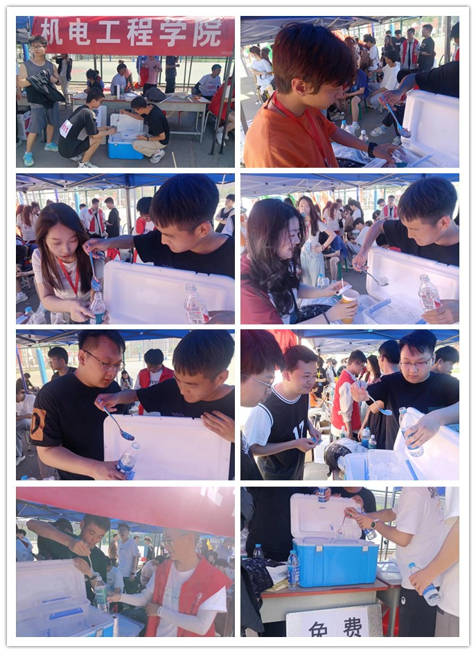 党委的精心安排下,机械制造系党支部和本科生第四党支部成立师生联合志愿服务小队,在运动会现场设点开展送冰块活动。迎着晨光,党支部的同志们便忙碌起来,将提前准备好的冰块装入保温箱,搬到服务点。在志愿服务过程中,党员们顶着炎炎烈日,充分发挥团结协作、无私奉献的精神,帮助许多师生加冰降温、冰敷消肿,志愿活动得到一致好评。