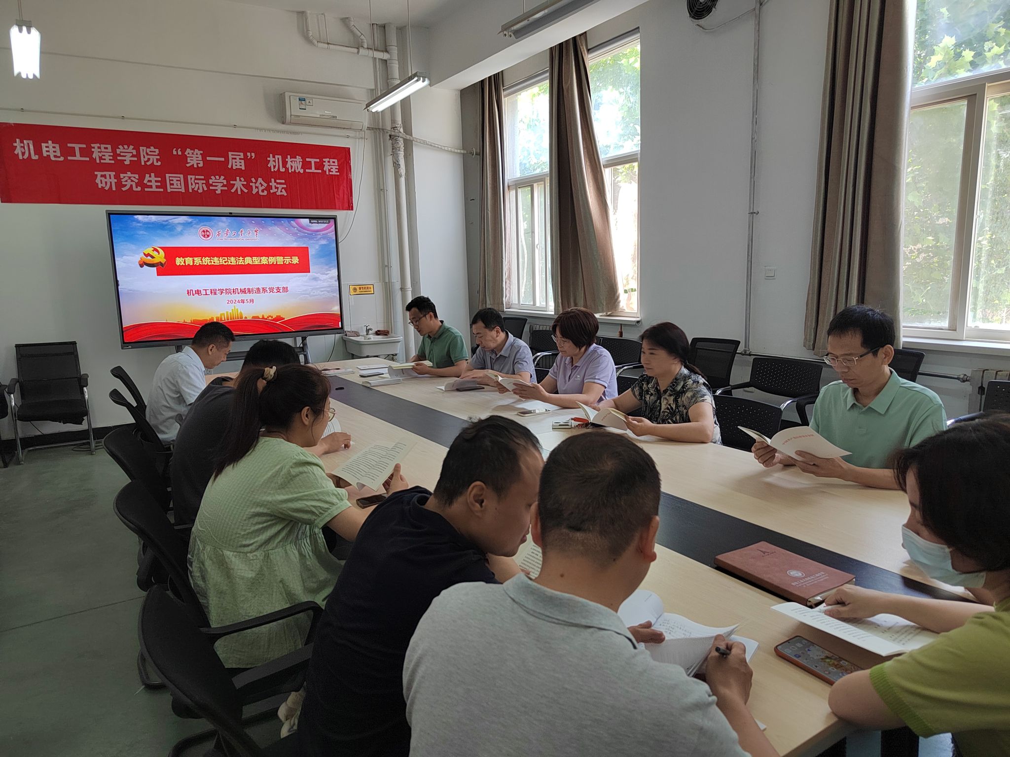 为深入学习贯彻习近平总书记关于党纪学习教育的重要讲话和重要指示精神,加强教师队伍纪律建设,5月15日上午,机械制造系召开《教育系统违纪违法典型案例警示录》专题学习,会议由支部书记张耿主持,支部党员和制造系群众教师参会。