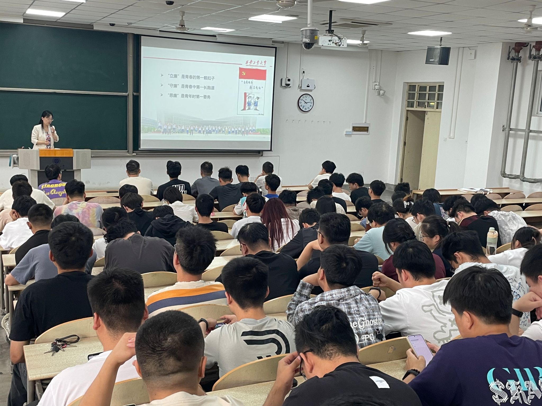 党委副书记、纪委书记姚敏茹以《廉洁与信仰同行 青春与奋斗相伴》为题,给2024届全体毕业生党员上了一堂纪律专题党课。