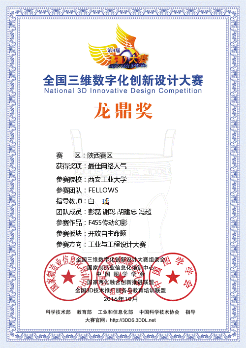 白瑀老师指导的彭磊等4名同学的参赛作品“F455传动幻影”荣获“最佳网络人气”奖及特等奖、由王沁老师指导的王思旺等3名同学的参赛作品“多功能钱币分拣机”荣获特等奖。上述两项作品将代表我校入围全国总决赛,全国总决赛将于12月份在江苏常州举行。