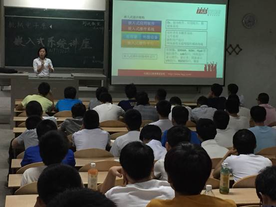 机械电子系系主任王洪喜教授介绍了当前前沿科技嵌入式系统( 嵌入式系统(Embedded system),是一种“完全嵌入受控器件内部,为特定应用而设计的专用计算机系统”,根据英国电气工程师协会( U.K. Institution of Electrical Engineer)的定义,嵌入式系统为控制、监视或辅助设备、机器或用于工厂运作的设备)。其次本次讲座华清远见工程讲师吴涛将他们的公司向大家做了简单介绍,北京华清远见科技信息有限公司简称华清远见,公司2004年成立于北京中关村,12年来始终专注于嵌入式及移动开发专业人才培养。培训内容主要包括嵌入式系统开发,Android开发,物联网开发三大方向。从短期高端到长期就业课程培训,再到产品研发,凭借专业的课程内容、强大的师资团队以及先进的研发技术受到客户和学员的好评。吴老师从嵌入式发展,工作定位,涉及领域等多方面讲述了嵌入式的就业前景和发展方向。