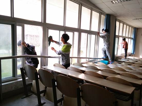 活动开始后,同学们欢声笑语的按照事先做好的分工到各自要清理的教室进行义务劳动。随着时间的推移,同学们额头上渗出细细的汗珠,打水、扫地、清除课桌上的笔迹、擦玻璃等等,大家在轻松愉悦中体会着劳动带来的“美”,将爱与感恩源源不断地传递给其他人。经过两个多小时的奋战,教室桌子上的笔迹被一一清除,就连凳子、玻璃、黑板、门和开关也一尘不染,在明媚的阳光下透着春天的气息。明亮、干净、舒适的教室,也给同学门营造了良好学习环境。