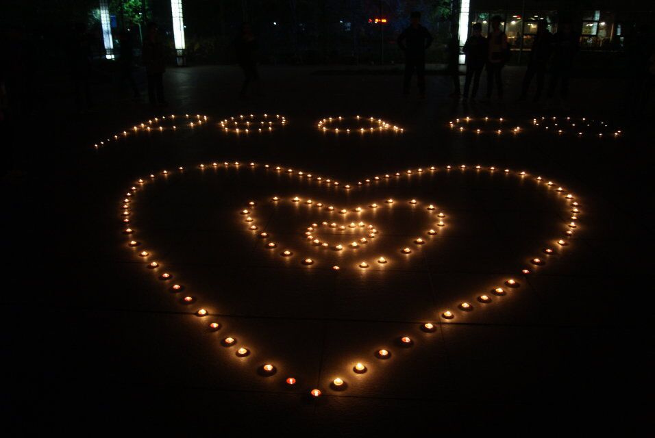 晚上19:00青协成员们庄重地在博苑广场用几百支蜡烛摆出了“peace(和平)”和爱心图案,以此来寄托哀思和对幸存者的祝福。本次祈福活动由南荣昌主持。宣布活动正式开始后,由宋荣新老师就本次祈福活动发表致辞,揭示本次活动的意义,让参与祈福的同学们感受和平的珍贵和来之不易,让同学们懂得:应当珍惜现在的和平时光,努力实现自己的梦想。随后参与活动的同学们在横幅上签名,表达对“珍爱生命,呼吁和平”主题的支持。同学们默默的低着头,手捧一支支蜡烛,将它轻轻放在爱心内,表达了对逝去生命的惋惜。流程最后一项三分钟的默哀仪式,同学们低着头,心里默默地祈福,从同学们庄严而沉重的神情中流露出他们对和平的希翼。这三分钟显得格外漫长,让同学们思索良多,体味良多。一颗颗对和平渴望的心汇聚在一起,共同祈福。