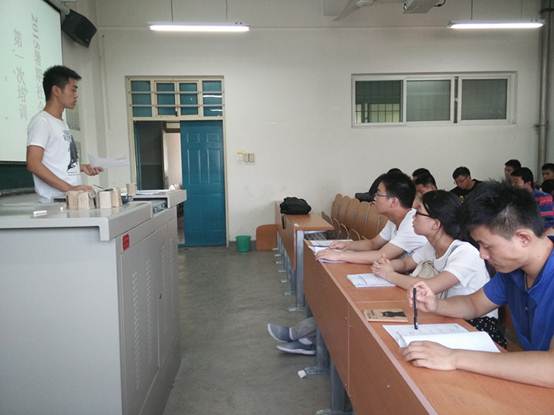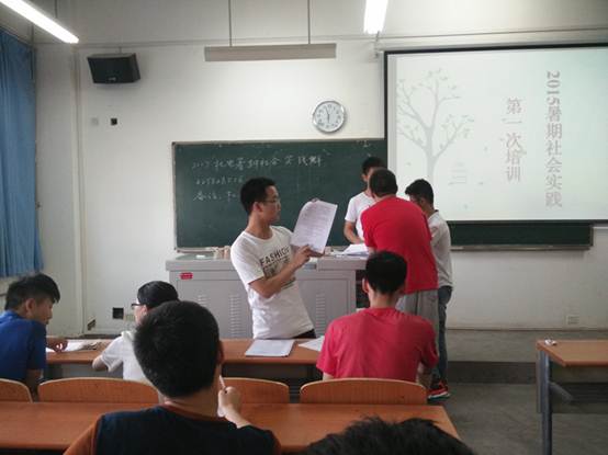 在教3-201教室举行2015年暑期社会实践第一次培训大会。参加本次培训的有团委副书记胡俊杰、机电“阳光”青协主席张雪和上一届青协主席潘兵、秘书长张晨以及各实践团队的队长。