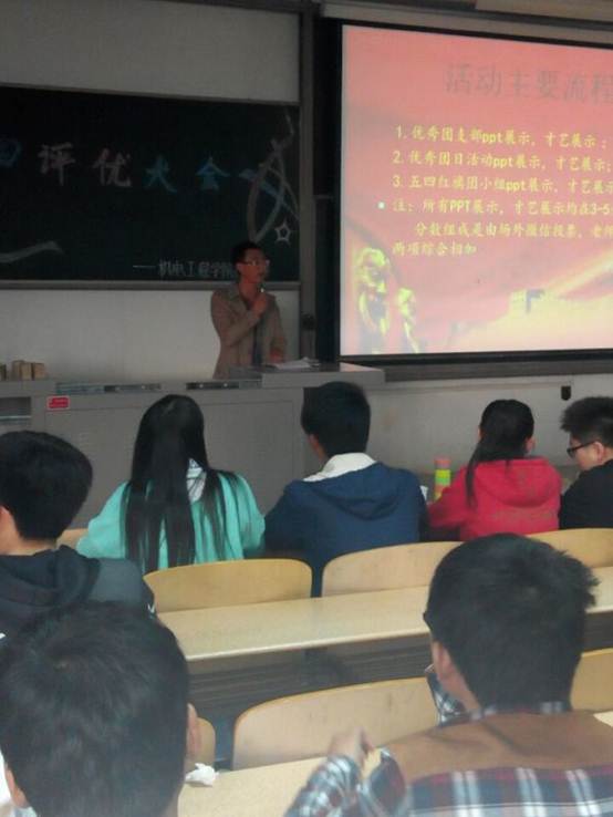 共青团工作中表现突出的基层团组织,以此激励同学们不断将正能量传递其他同学。紧接着,是各个参赛班级的活动风采展示环节,通过PPT播放形式展示了班级同学的花样风采,在现场,也不乏感人至深的演说和动人美妙的歌声。场上是一幕幕精彩地角逐,台下是评委们难以取舍地打分。