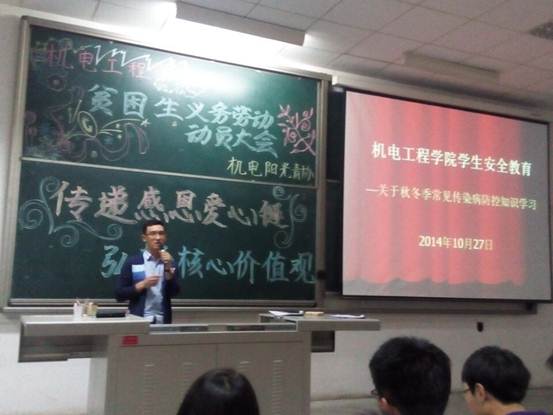 宣讲过程中,黄老师提及多种疾病,包括出血热、流感等等,他用幽默诙谐的话介绍疾病知识,同时提出防控措施,比如:定期开窗通风以保持气流流通,经常锻炼身体提高抵抗力等。另外,黄老师专门强调了同学们有关请假的相关事宜,要求同学们履行正常的请假手续,杜绝擅自离校。提醒同学们外出务必加强安全防范意识,擦亮眼睛,注意交通安全,不要搭乘非法营运车辆,保护好个人财产及随身物品。