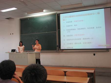 去年的实践活动基本情况,并肯定了实践活动成果,但同时也提出了一些指导意见。张老师建议同学们要围绕3大主题——光辉党旗引领成长、志愿服务共享和谐、创新争优促进发展开展实践活动。同时,他还强调了大学生暑期社会实践的重要性,鼓励大学生要珍惜这种实践机会,在活动中有所收获,满载而归。最后,张晖老师还讲解了暑期社会实践的一些注意事项,针对大一学生第一次接触到暑期社会实践,他特别从社会实践当中的三个问题“怎样联系社会实践地点?”“怎样设计社会实践策划?”“怎么填写社会实践表?”做了详细介绍。