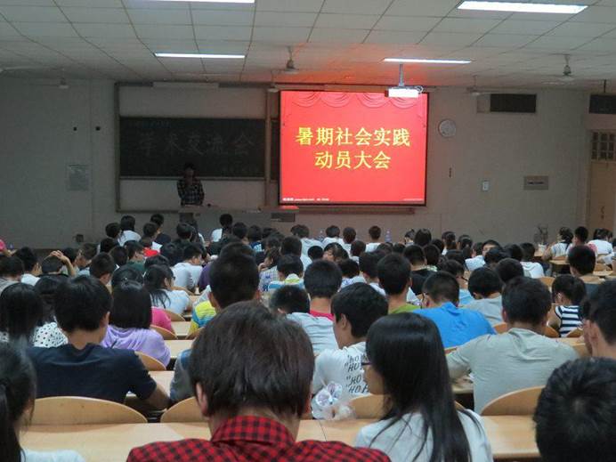 于教1-102召开2014年暑假社会实践动员大会。本次动员大会以视频展示的形式,给大家讲述往届学生的实践活动,12级300余名同学参加此次大会,动员效果良好。