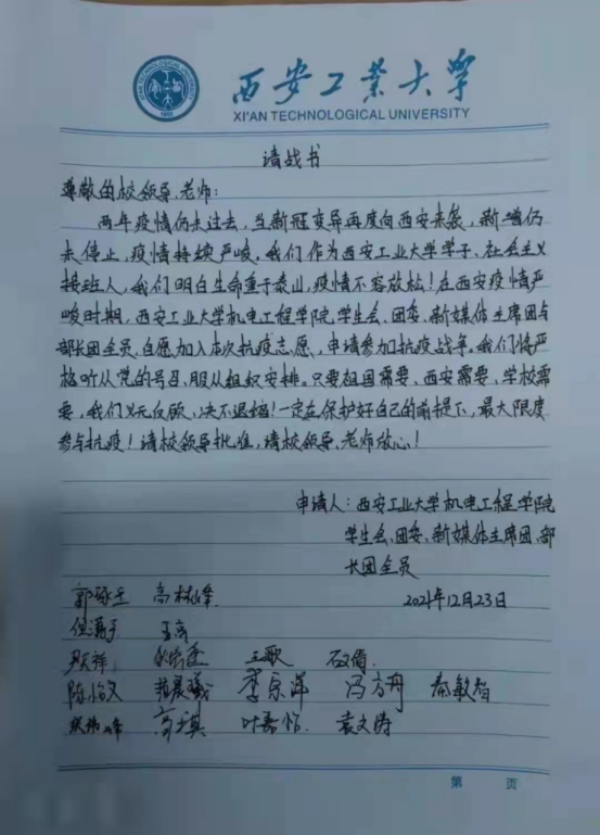 团委,学生会,及新媒体主席团,部长团全员向学校提交请战书,为防疫工作贡献自己的一份力。此外,因封校而带来的不便,西安工业大学为保障学生们的生活需求,积极调配物资,为每位同学发放了口罩等防疫必需品。机电工程院团学组织展现青年学子力量,积极配合老师行动,主动承担起运输、分配防疫物资的重任。