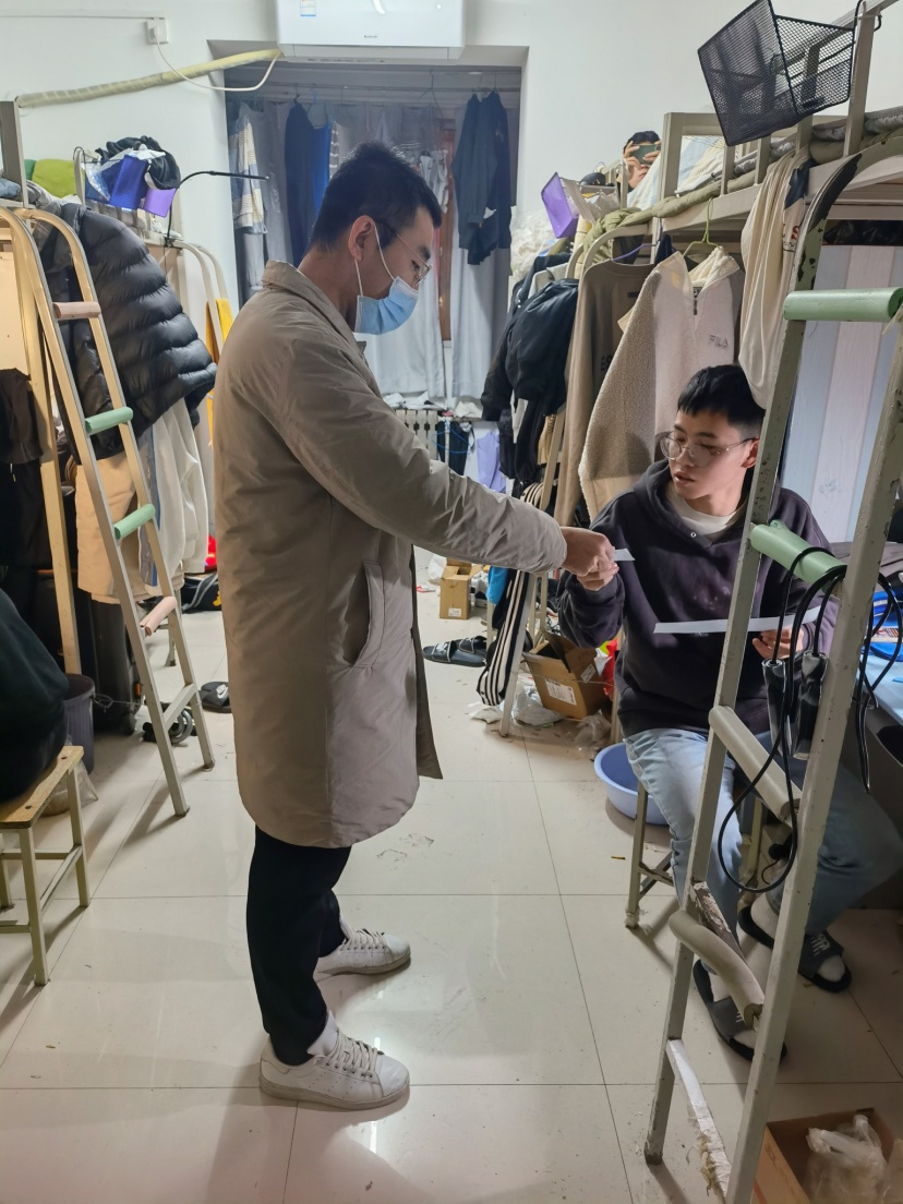 防疫面前无小事,学生关注的事就是最重要的事。这些天里,我在做好学院进驻公寓专班包干的9公寓的具体工作的同时,一刻也不敢松懈18级学生的日常管理工作。统计亟需药品清单、督促同学们做好每天的晨午检查、监督同学们一个不漏的进行核酸检测、分发防疫物资等,从早到晚,过的忙碌而充实。这些天里,我每天深入学生宿舍,和他们聊聊天谈谈心,解决一些生活问题,缓解他们不能按时回家的焦虑心情。虽是封闭管理、战时状态,我和学生们反而更能打成一片,心更近了,情更浓了,孩子们也在这次考验中成长了、蜕变了,这是作为他们的老师,最欣慰的事。