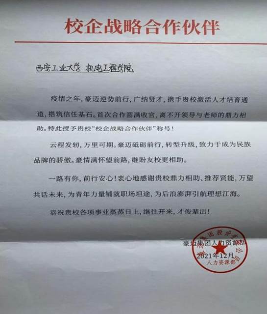 获得由豪迈集团授予的“校企战略合作伙伴”称号。足球投注网站