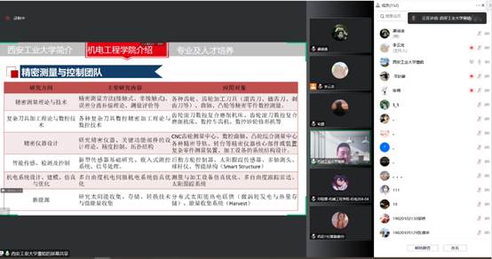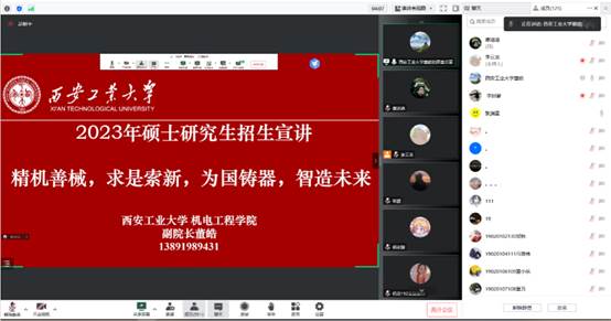 的办学理念:精机善械、求是索新、为国铸器蹲、智造未来。紧接着,就本西安工业大学的历史沿革、发展现状、研究生培养和团队研究方向四大方面展开详细介绍,其中对考研学子较关心的报名流程、考试内容、招生人数、奖助体系、研究团队、就业发展和学校地理位置等内容进行了着重讲解,详尽地展现了西安工业大学高水平的科研平台和良好的就业发展。