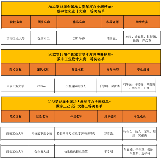 万宏强老师指导的《轮驱动滚刀式家用草坪修剪机》团队、千学明老师指导的《仿生蜘蛛搜救装置》团队分获3等奖,充分展现了西安工大学子积极拼搏,勇于进取的探索精神。