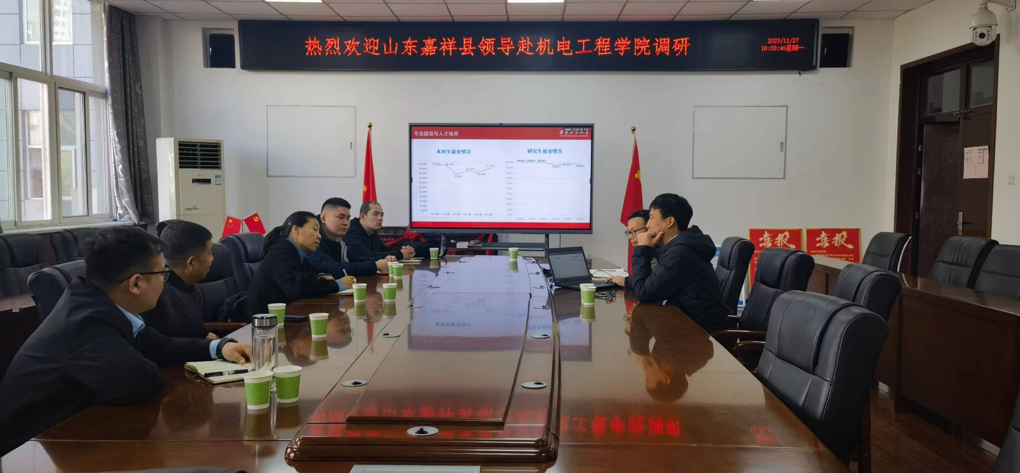 王洪喜对任丽娟一行的到来表示欢迎,并介绍了学院专业设置、毕业生人数、学生特点以及毕业生就业意向、学科建设水平与学科研究、技术研究特色、目前阶段科研重难点工作。