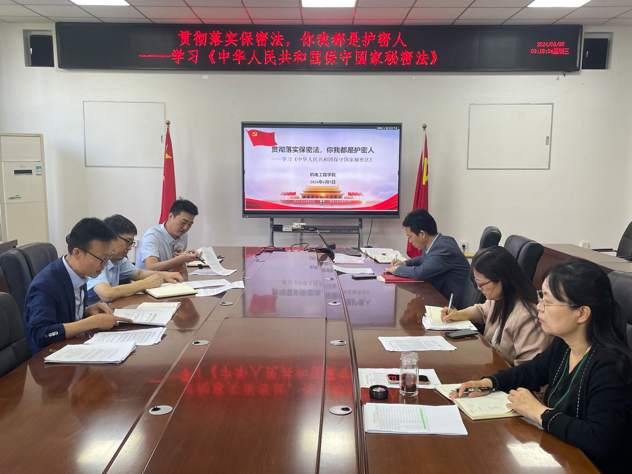 召开专题会议学习《中华人民共和国保守国家秘密法》,会议由学院党委书记程新峰主持,党委委员、理论中心组成员参会。