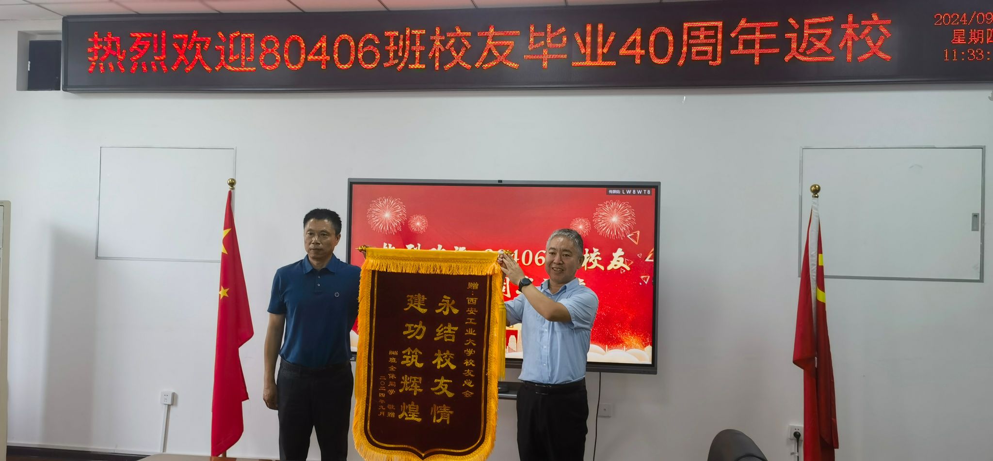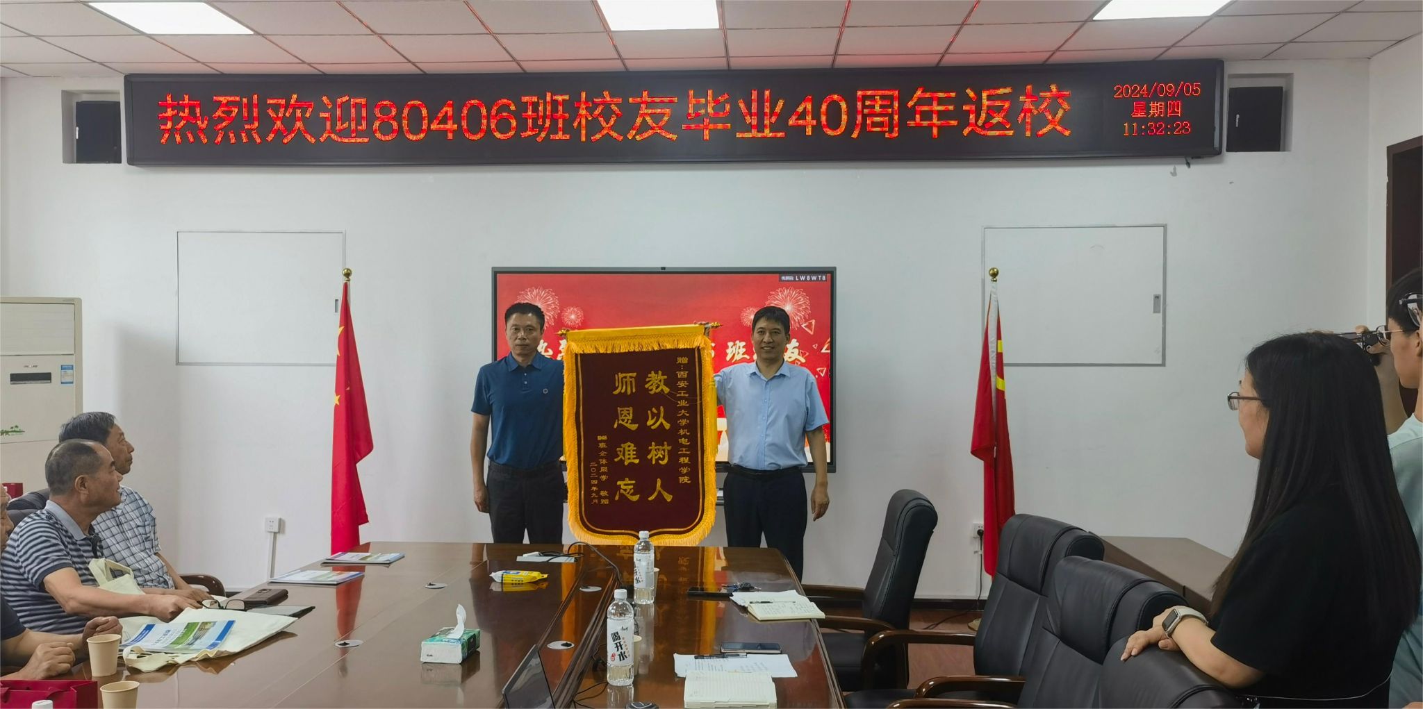 80406班班长李翔代表返校校友回忆了在母校度过的那些青葱岁月,对那段充满汗水与欢笑、知识与成长的时光表示了深深的怀念。同时,他也代表全体校友,对母校和老师们的辛勤培育表示了最诚挚的感谢,正是有了这份无私的奉献与引导,才让他们能够在各自的领域里发光发热、成就一番事业。期待着母校培养更多优秀人才。为表达对母校的感激之情,校友代表向学院赠送“教以树人 师恩难忘”锦旗,向校友总会赠送“永结校友情 建功筑辉煌”锦旗。