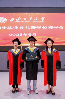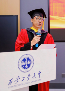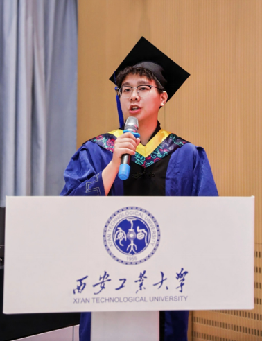 毕业生代表李悦上台发言,深情回顾了在西安工大的求学历程:从怀揣军工梦想踏入“兵工七子”学府,到在学院严谨学风和导师悉心指导下深耕机械领域,发表多篇学术论文,参与军工企业横向课题,将传动分析、故障诊断等实验室理论转化为解决工程现场问题的能力,实现了从学生到准工程师的蜕变。他特别感恩学院提供的产学研融合平台,使他在攻克科研问题的过程中锤炼了“精工博艺”的匠心,更通过学生工作深化了责任担当意识。