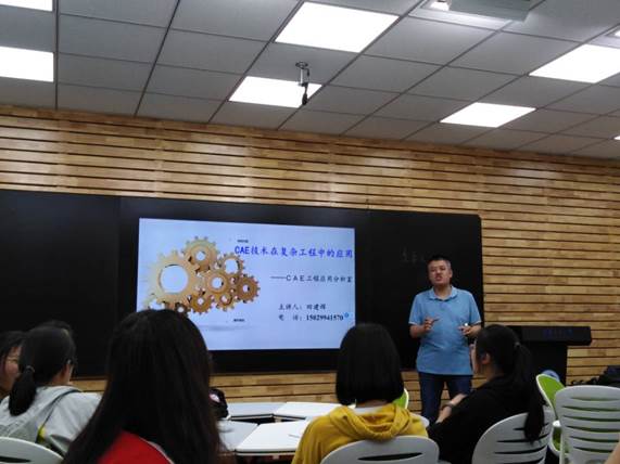 会议伊始,田建辉副教授简单介绍本次宣讲会的主要内容及目的,并向大家做了对本次宣讲主题“文献检索”及“CAE技术”认知程度的了解。首先,田老师就本科生和研究生在写毕业论文和学术论文时,如何正确检索文献的重要性进行了阐述,并对本次参加宣讲会的同学提出要求,要求大家在本科前两年争取掌握并熟练利用学校的便利资源,在图书馆的电子书库资源做文件检索。在对图书馆官网网页功能的介绍中,田建辉副教授现场带领同学们一起解决如何在我校图书馆数据库正确、高效地检索文献的问题。接下来田老师主要对CAE在复杂工程的应用做了初步的讲解,为同学们介绍了自己的团队近几年在CAE上的项目以及成果展示,通过对这些案例的分析,让同学们初步了解CAE在工程设计和生产上的技术优势。在会议后期,田老师为同学们讲述了CAE的发展前景以及我们学校在对CAE技术工程研发上做的投资和建设,鼓励有能力和想法的同学参加“CAE实验孵化基地”,培养同学们自己在CAE技术上的本领。