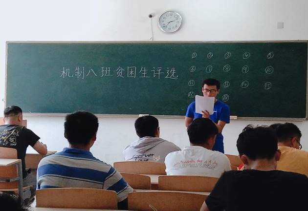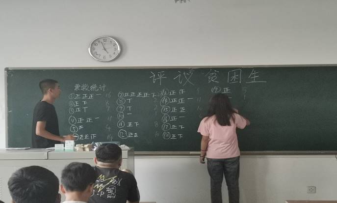 会议伊始,辅导员宣读了《2019-2020学年家庭经济困难学生认定工作安排》,让学生充分理解贫困生资格的评定规则。其次由班长现场给贫困生申请书编号,并随机在班中抽选未申请的一名同学朗读申请书,申请书中不出现个人信息,保证过程公平公正。随后,评议小组依据评议规则和申请书内容做出投票,匿名写下申请书编号,每人五票,统一收至班长处。接着,现场抽选两位同学唱票、计票,并统计投票结果。期间,班主任老师向同学们强调在今后的学习和生活中需要注意的要点,强调在丰富课余活动的同时要注重学习,把学习放在第一位。同时指出,同学们在学习和生活上遇到困难要积极寻求帮助,及时解决。至此,各班贫困生资格名单已出炉,目前贫困生评议工作正处于公示阶段。