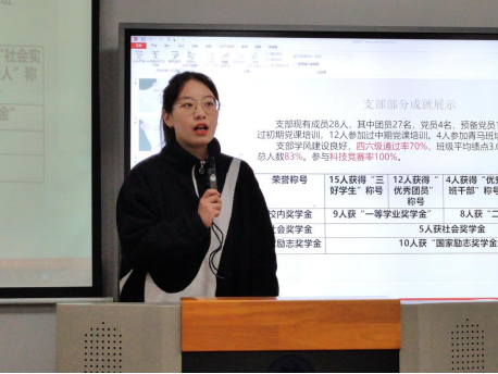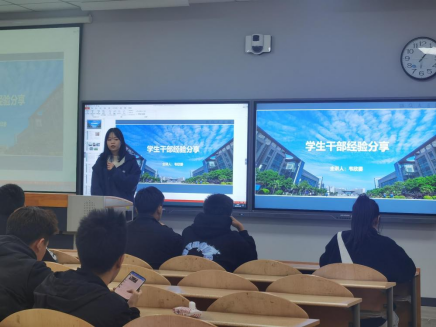 接着是赵思琦发言,她针对在班干活动中如何兼顾自我发展开展本次分享。她通过目前所带领班级取得的成果、以及自身在各方面取得的成就,多方面分层次开展叙述。在工作方面,她建议大家多展开有意义、有特色、有内涵的班级活动,增进班级凝聚力和向心力,在班级建设过程中要注重“氛围感”,全体班干部之间要同心同力,共同建设优秀的班集体。在学习方面,她建议大家抓住机会,确立目标,分清主次,做好时间规划,积极发展自己的兴趣爱好,不断充实自己的大学生活。