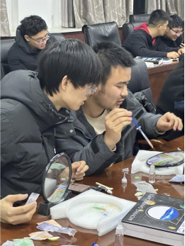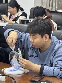 参与同学们使用透明亚克力立体画框、彩色流沙及矿物颗粒,通过分层填充、注液融合等步骤,创作出动态山水、星空等主题的3D流沙画。沙粒在重力作用下自然流动,形成千变万化的立体景观,学生在专注创作中体验“心流”状态,暂离现实压力。