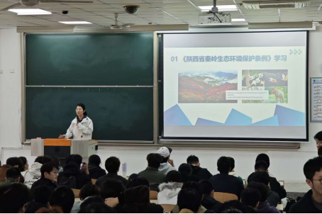 辅导员带领全体学生学习《陕西省秦岭生态环境保护条例》,结合秦岭生态保护区实例,阐释生态环境保护的法律责任,强化学生生态文明实践意识。