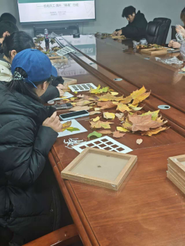 活动以“理念联结—指尖创作—心得传递”为脉络铺展。活动伊始,工作人员以兵工领域“物尽其用”的实践智慧为引,串联秋季落叶的自然属性与“变废为宝”的环保理念,让“创新奉献”的兵工精神与贴近生活的自然材料产生联结。讲解中,同学们观察着叶子的脉络与形态,紧绷的情绪也随落叶的舒展逐渐松弛。