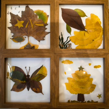手作实践环节,落叶与相框、剪刀、双面胶等工具摆上桌面,同学们自主开启创作:有人将叶片修剪层叠出立体肌理,有人借不同叶形的组合打造独特装饰——看似简单的剪、贴动作里,大家慢慢从“怕出错”的拘谨中抽离,专注于叶片角度的调整、细节的打磨,指尖的忙碌让压力暂时“退场”,沉浸感成了最好的情绪缓冲。
