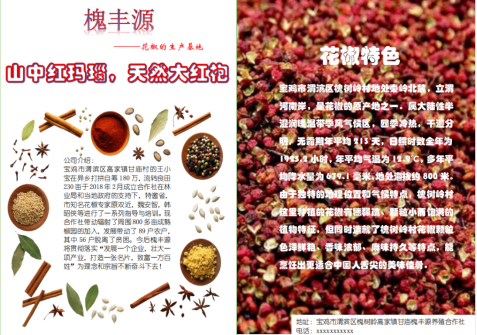 为进一步提高宝鸡市渭滨区甘庙村花椒的市场竞争力、提升品牌形象,团队整合优势资源,制作宣传扉页,并设定“山中红玛瑙 天然大红袍”为“槐丰源”花椒品牌的核心宣传标语。同时借助视频推广,搭建直播平台,期间共制作宣传短片十余篇,曝光量达20余万,并吸引到众多精准粉丝,更好的建立品牌形象,提升花椒知名度和美誉度,提高品牌价值。