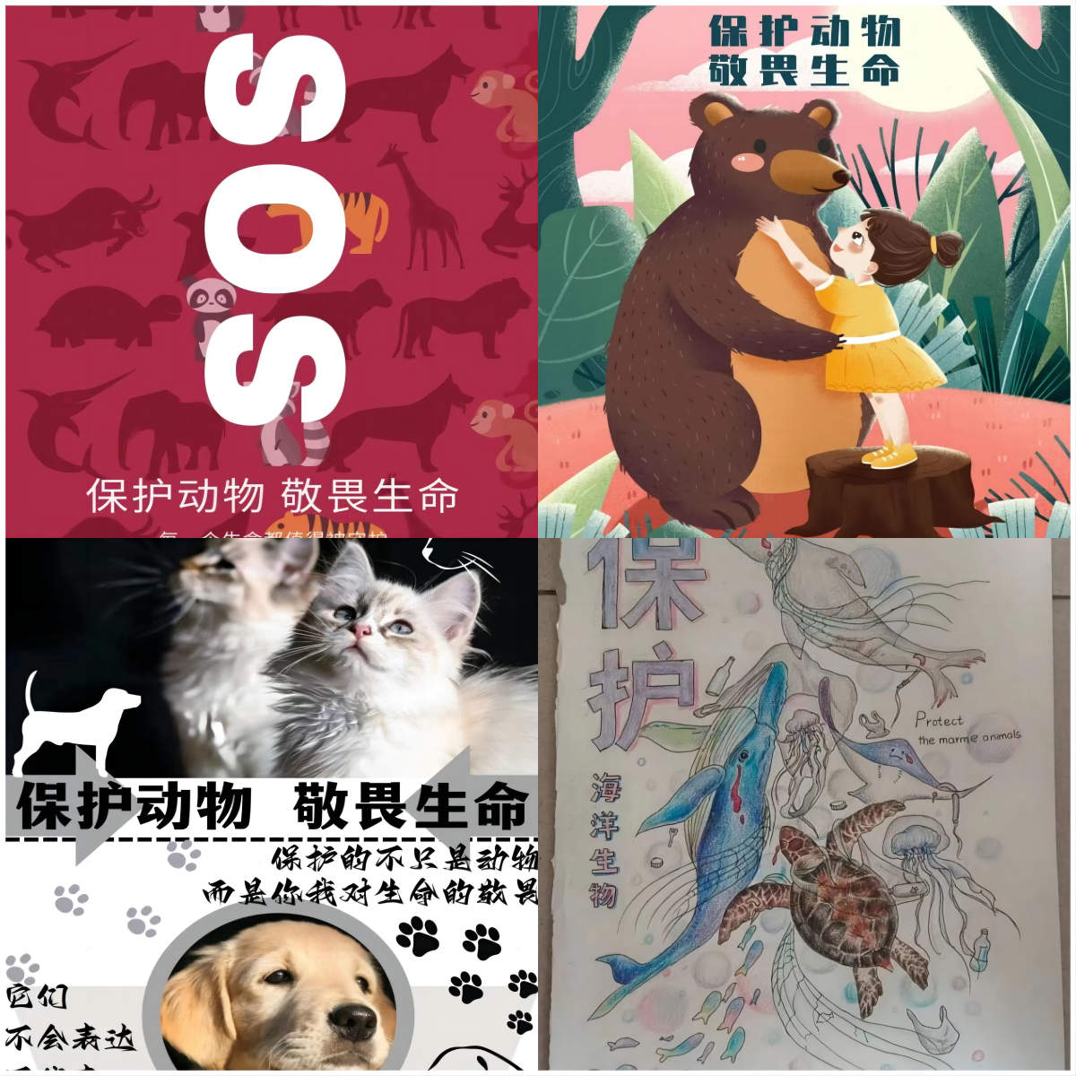 同学们根据保护动物的主题,从保护野生动物、海洋生物、濒危动物等方面绘画或制作出各种各样的优秀作品。海洋生物像无助的小船在污染的海洋里挣扎;四处游荡的流浪动物依靠垃圾中的残羹剩饭勉强度日;终日遭受虐待的宠物无助绝望的眼神……