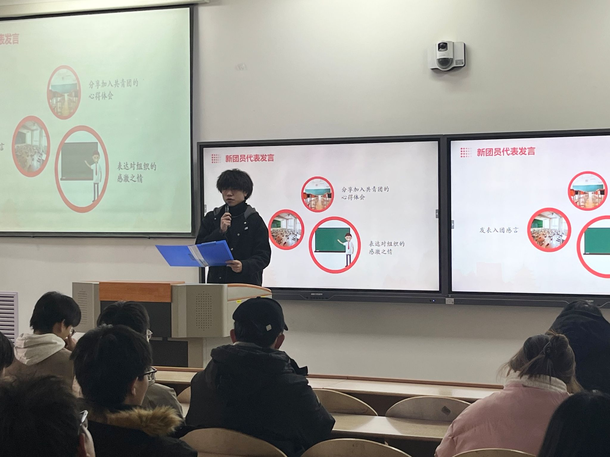 第一项,团员国琪蕊带领新团员面向团旗宣读入团誓词。第二项,老团员代表李倩婧发言。她对各位新团员进行了团的基本知识主题教育,让新团员们对共青团的认识和理解更加深刻。